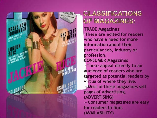 - 2. TRADE Magazines-These are edited for readerswho have a need for moreinformation about theirparticular job, industry orprofession.CONSUMER Magazines--These appeal directly to anaudience of readers who aretargeted as potential readers byvirtue of where they live.-- Most of these magazines sellpages of advertising.(ADVERTISING)-- Consumer magazines are easyfor readers to find.(AVAILABILITY)