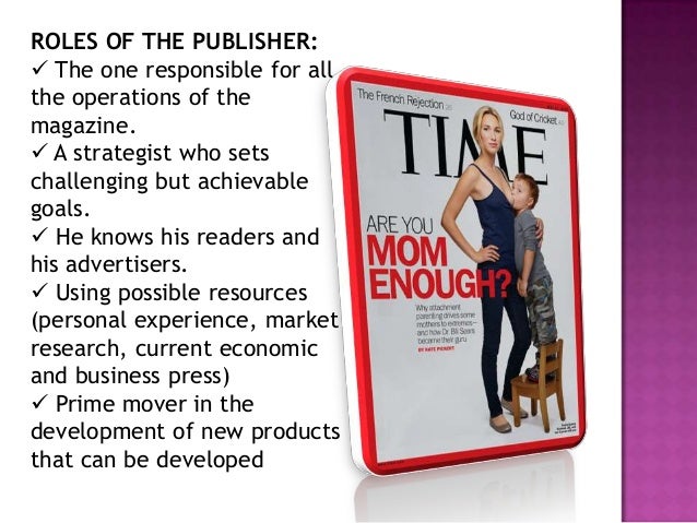 - 5. ROLES OF THE PUBLISHER: The one responsible for allthe operations of themagazine. A strategist who setschallenging but achievablegoals. He knows his readers andhis advertisers. Using possible resources(personal experience, marketresearch, current economicand business press) Prime mover in thedevelopment of new productsthat can be developed
