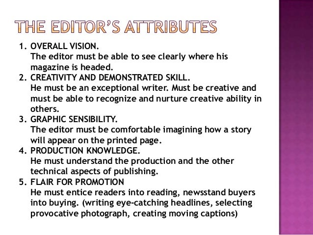 - 6. 1. OVERALL VISION. The editor must be able to see clearly where his magazine is headed.2. CREATIVITY AND DEMONSTRATED SKILL. He must be an exceptional writer. Must be creative and must be able to recognize and nurture creative ability in others.3. GRAPHIC SENSIBILITY. The editor must be comfortable imagining how a story will appear on the printed page.4. PRODUCTION KNOWLEDGE. He must understand the production and the other technical aspects of publishing.5. FLAIR FOR PROMOTION He must entice readers into reading, newsstand buyers into buying. (writing eye-catching headlines, selecting provocative photograph, creating moving captions)